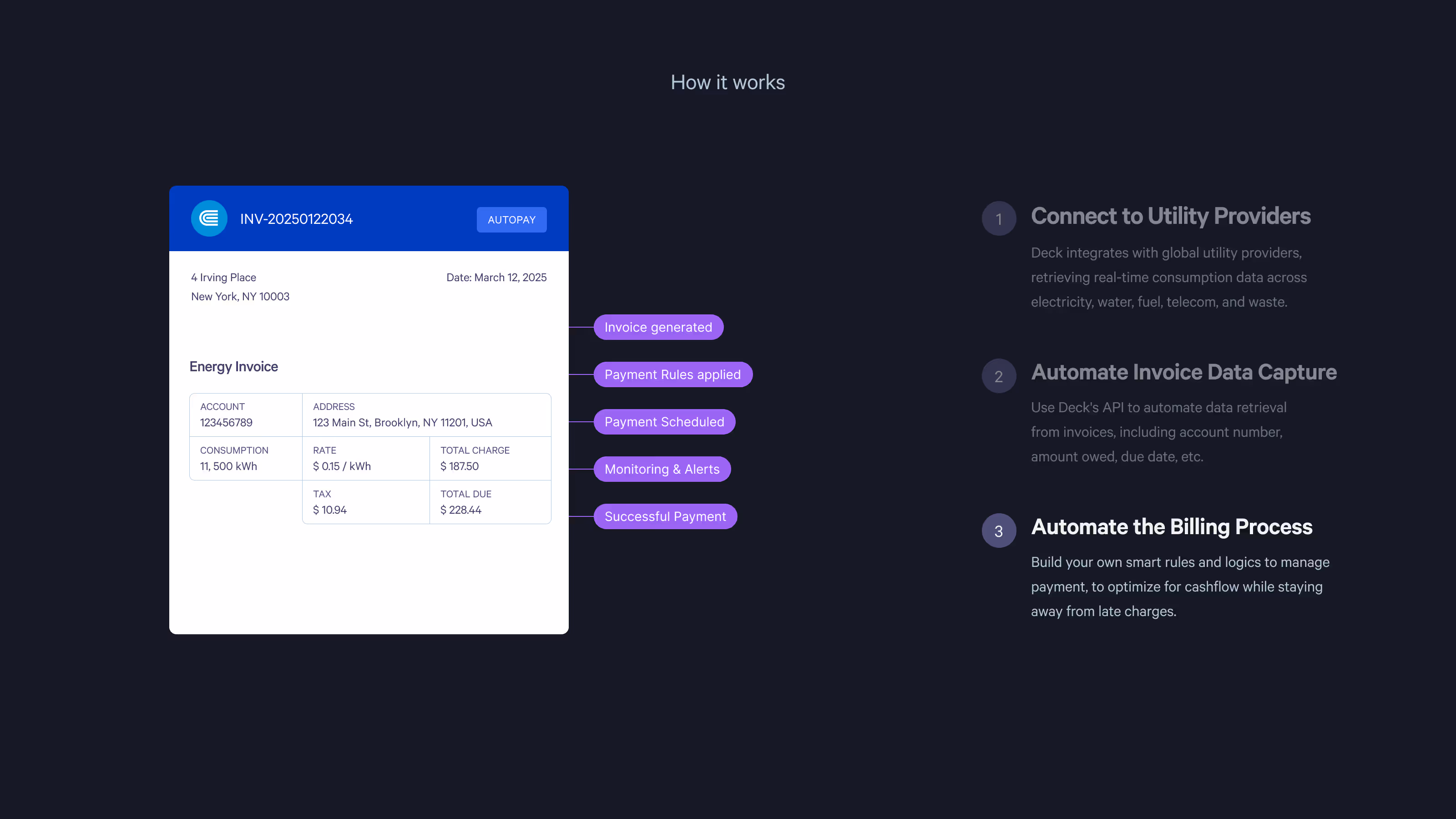 Deck.co helps businesses automate the flow of Data from Providers (such as Utility Providers) into their internal platforms. This includes syncing Invoices and Billing Data and transforming it into actionable Insights. The challenge was to visually communicate how this data moves, what systems it touches, and how it benefits businesses. Instead of hiding the complexity, the goal was to make the integrations and processes understandable at a glance - turning technical workflows into clear, visual stories that show Deck’s value.