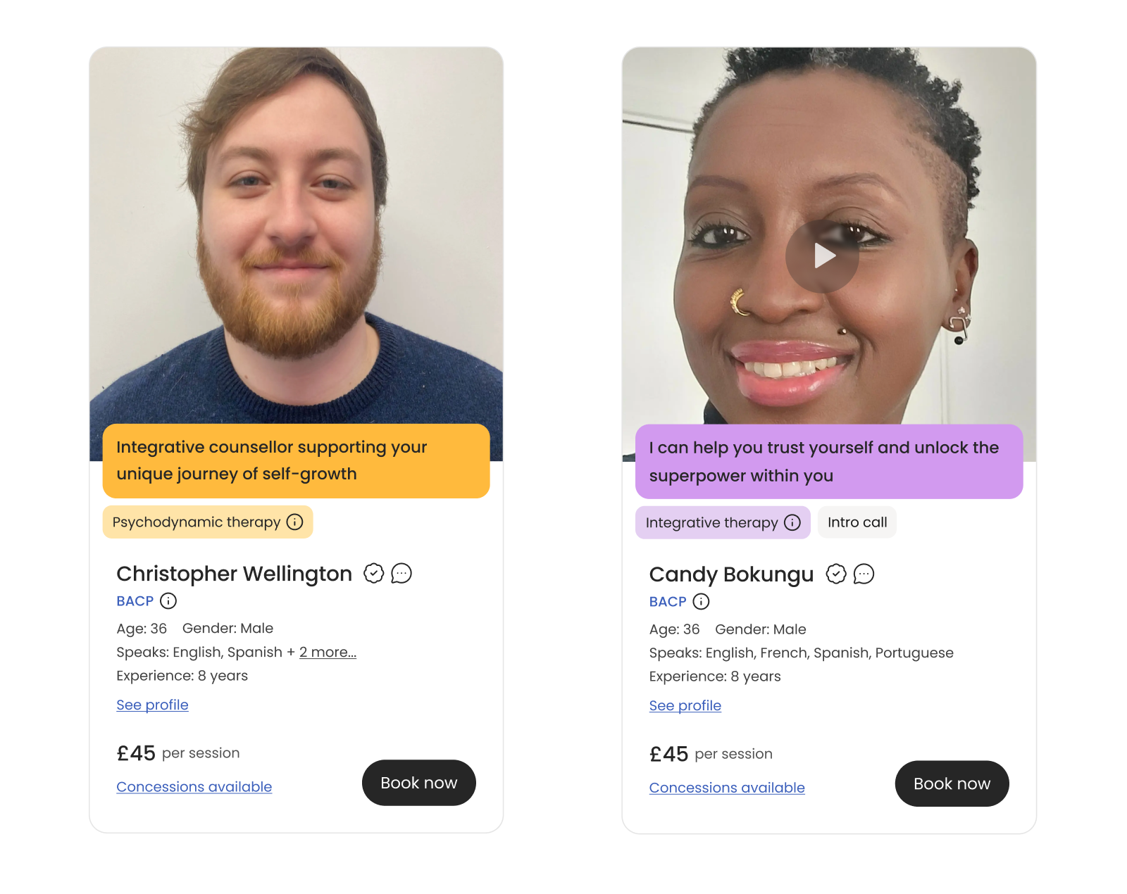 Therapist cards were designed to make key information easy to scan, reducing cognitive load during browsing and helping users quickly identify relevant options.