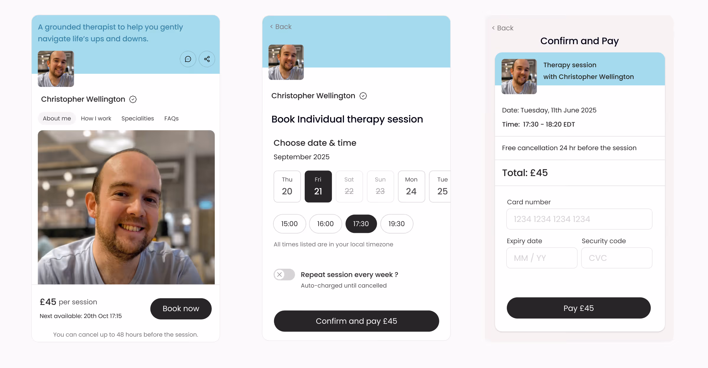 I simplified the experience into a minimal, three-step flow, guiding users from therapist selection to confirmation with clarity and confidence.